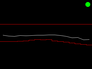 The image below shows the typical display during the spectrum test: the white line is the measured signal strength. The red lines indicate the minimum and maximum allowed values. The green circle in the upper right corner indicates that the signal strength is within the limits. A downward-pointing red triangle would indicate that the signal is too weak, an upward-pointing yellow triangle would indicate that the signal is too strong.